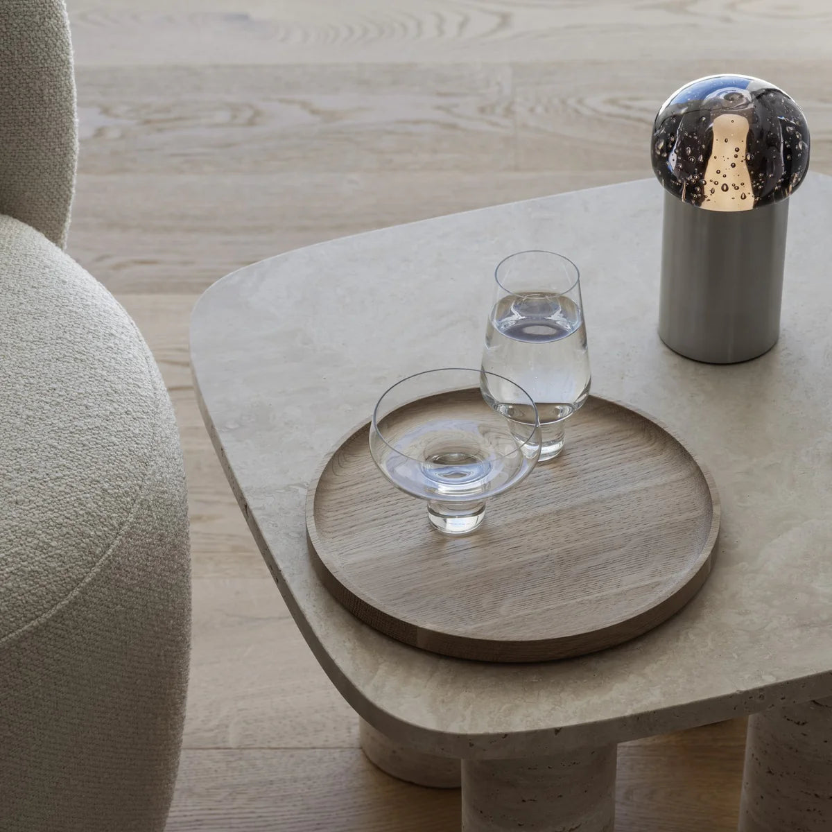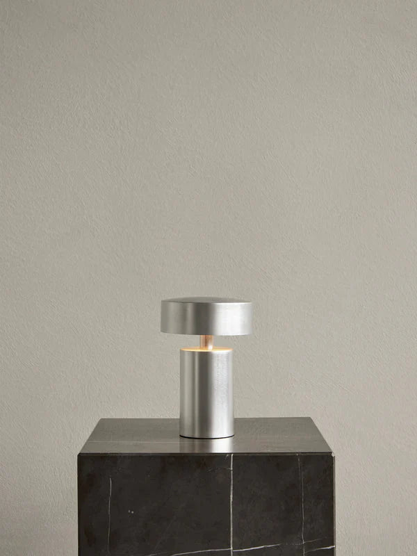 La lámpara de mesa portátil Kizu rezuma romance oscuro en esta nueva versión con una base realizada en mármol Rosso Levanto. Desde el borgoña hasta el chocolate y generosamente adornada con vetas blancas, esta rica piedra parece sacada directamente de los palacios italianos. Su presencia dramática sólo se intensifica cuando cae la oscuridad y se enciende la luz. Mediante un pequeño botón metálico situado en la parte superior de la lámpara, la luz se regula fácilmente en tres niveles.